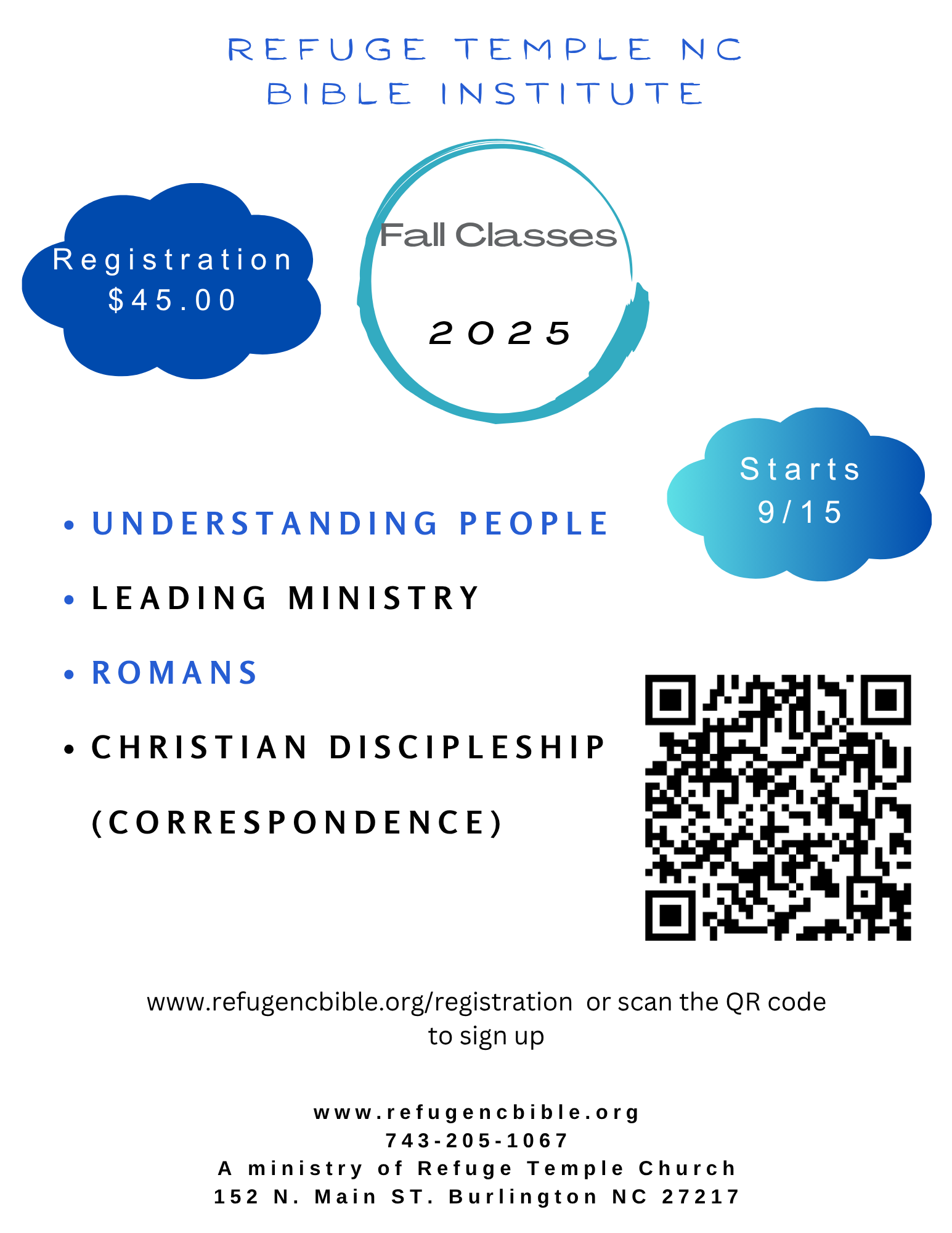 Welcome to the registration page of Refuge Temple NC Bible Institute is simple. We do not require you to submit a general student application. Registration for individual classes serves as the application mechanism.